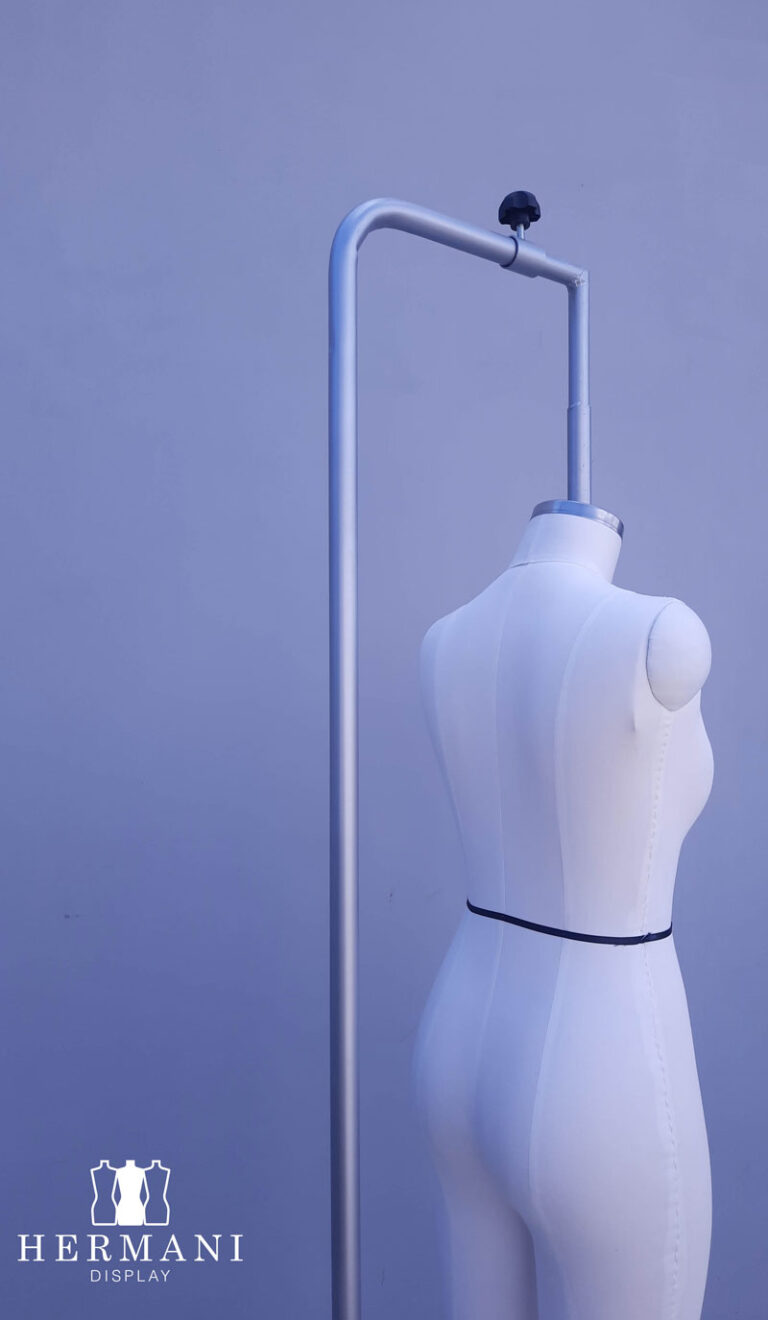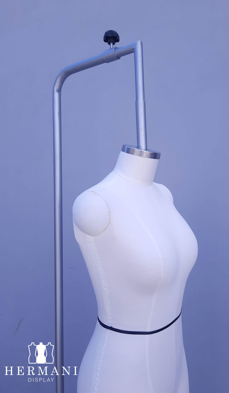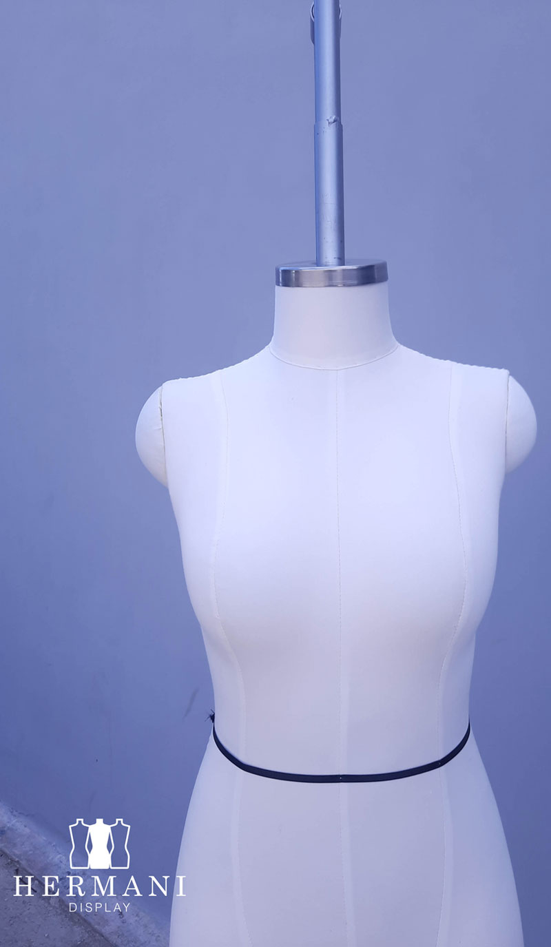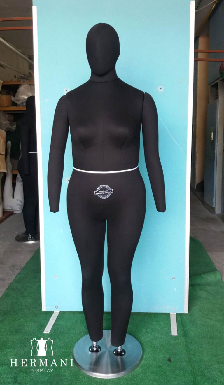 Maniquí industrial femenino para confección y drapeado, tapizado en espuma tela, dril negro o beige, que permite el uso de alfileres.