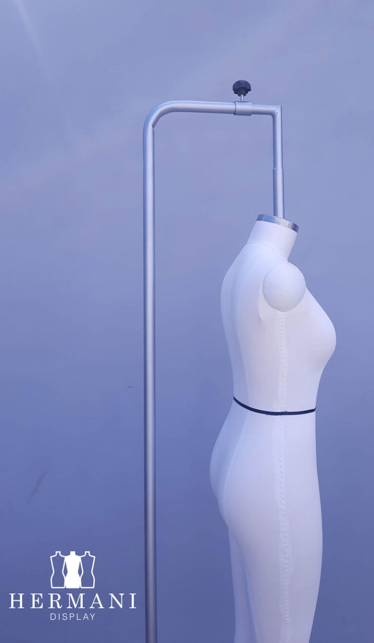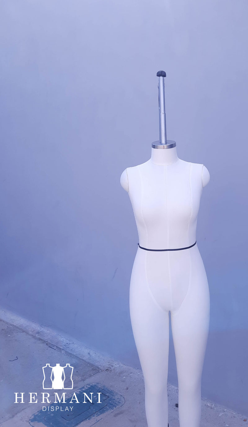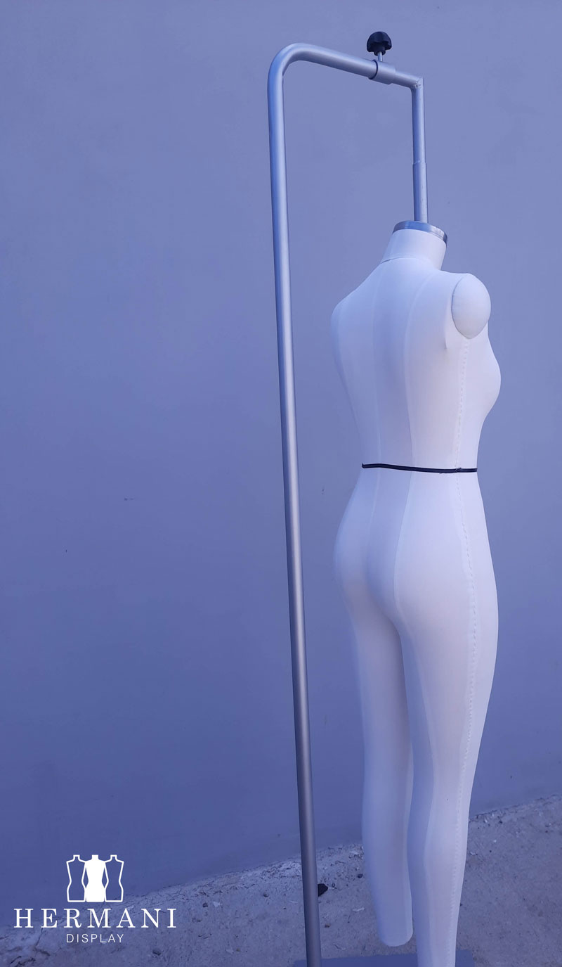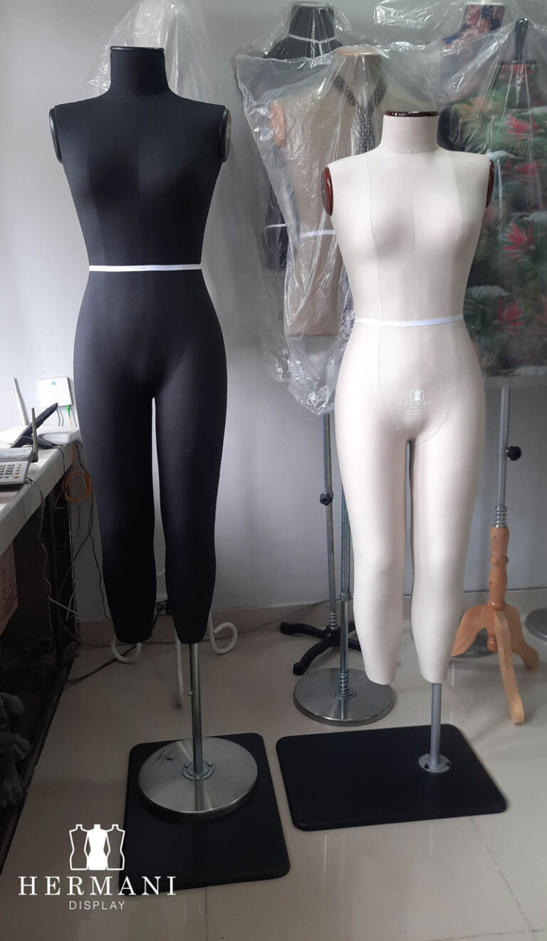 Maniquíes industriales con piernas largas y brazos: Tapizados en espuma y forrados en tela dril negro o beige, con o sin cintas de marcación, tapas decorativas en madera para hombros y cuello.