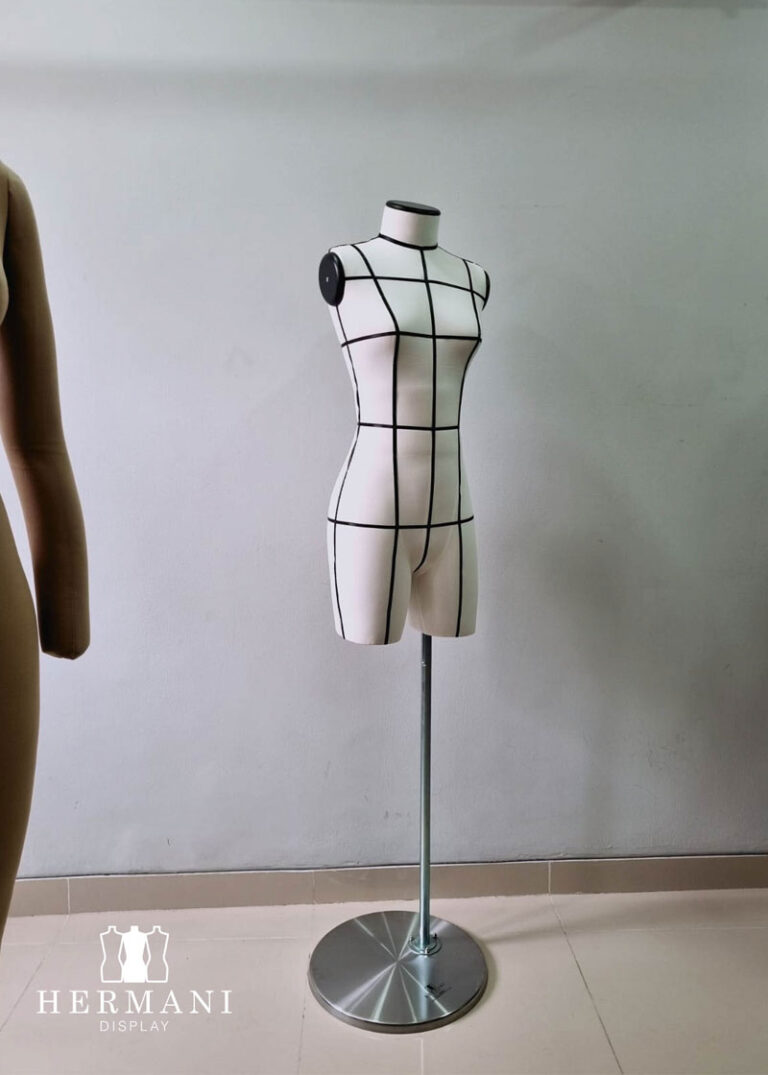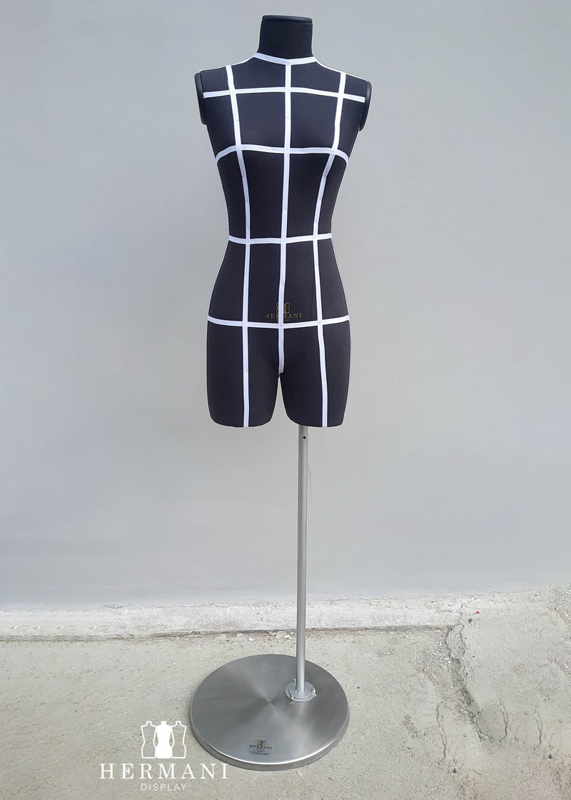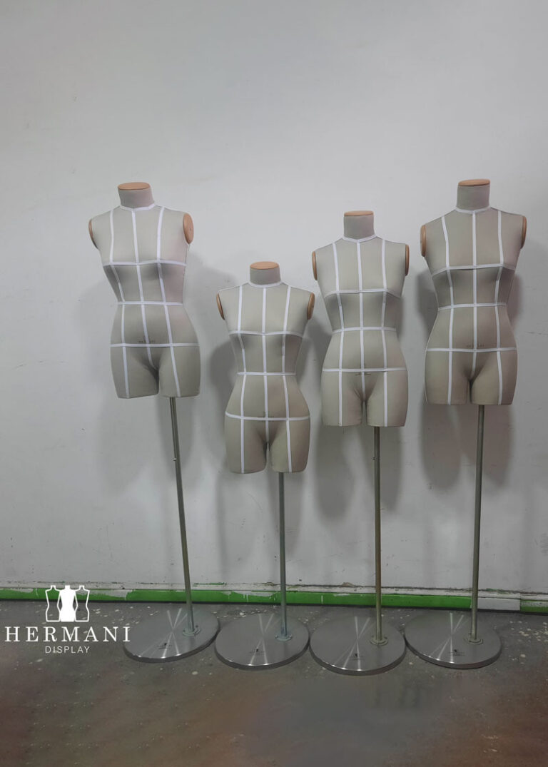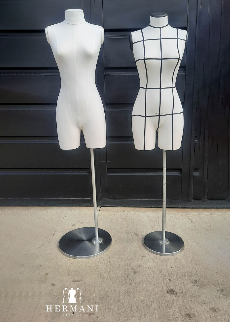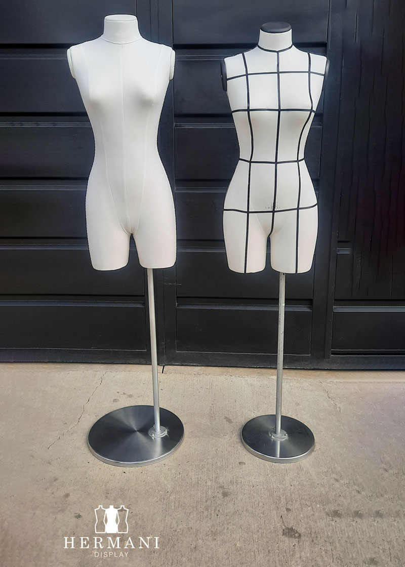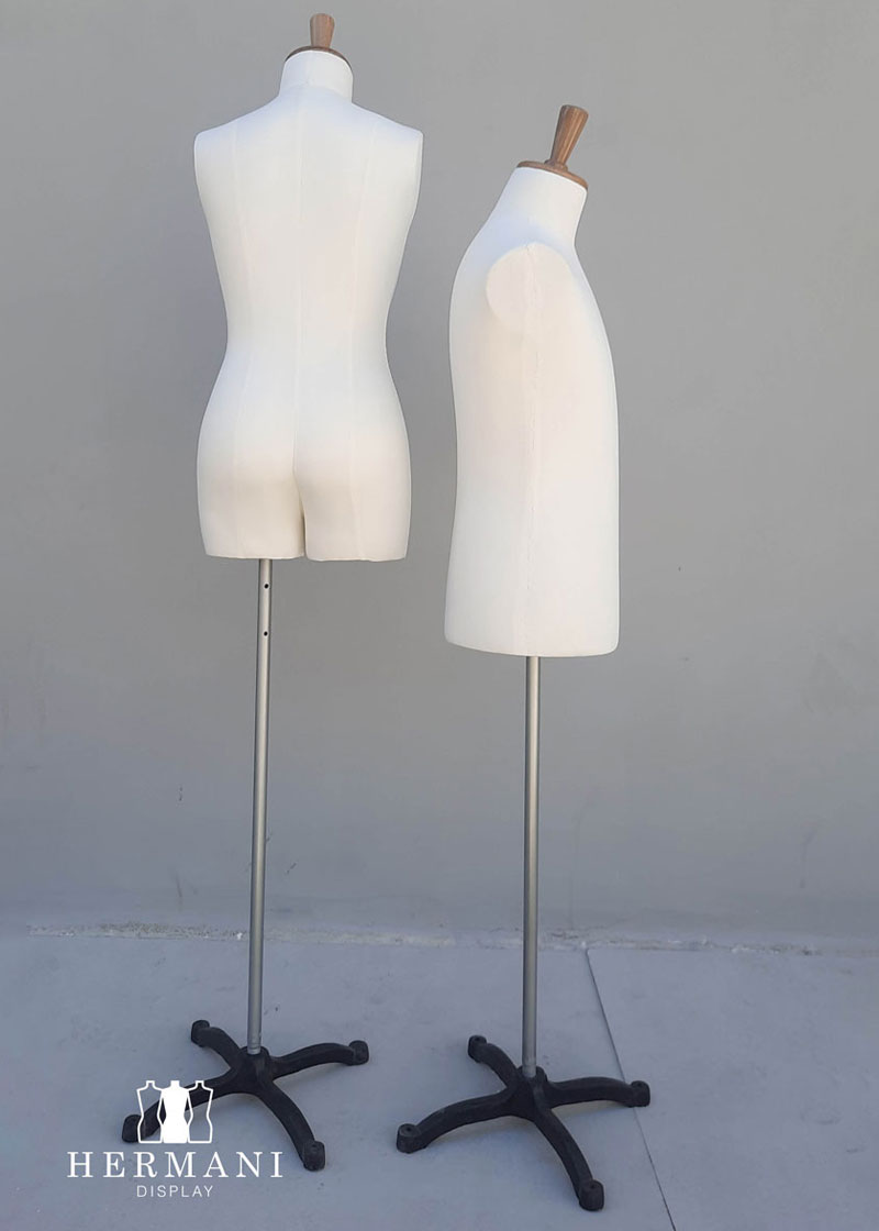 Bustos 3/4 Gabarit de Costura y Exhibición: Busto piernas 3/4 femenino para costura y diseño de prendas de vestir, tapizados o forrados en tela dril negro o beige, con o sin cintas de demarcación.