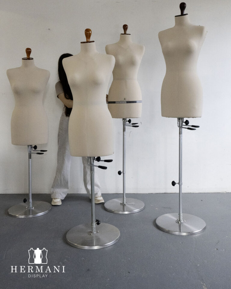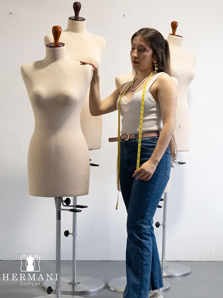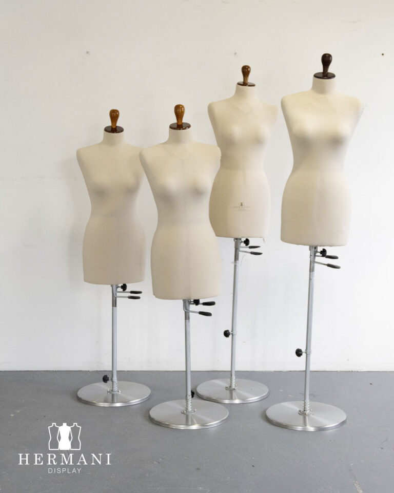Maniquíes industriales femeninos para confección, ajustables y/o expansibles. Gradúa de la talla 8 a la 16, forrados en tela licra negra, beige y roja.