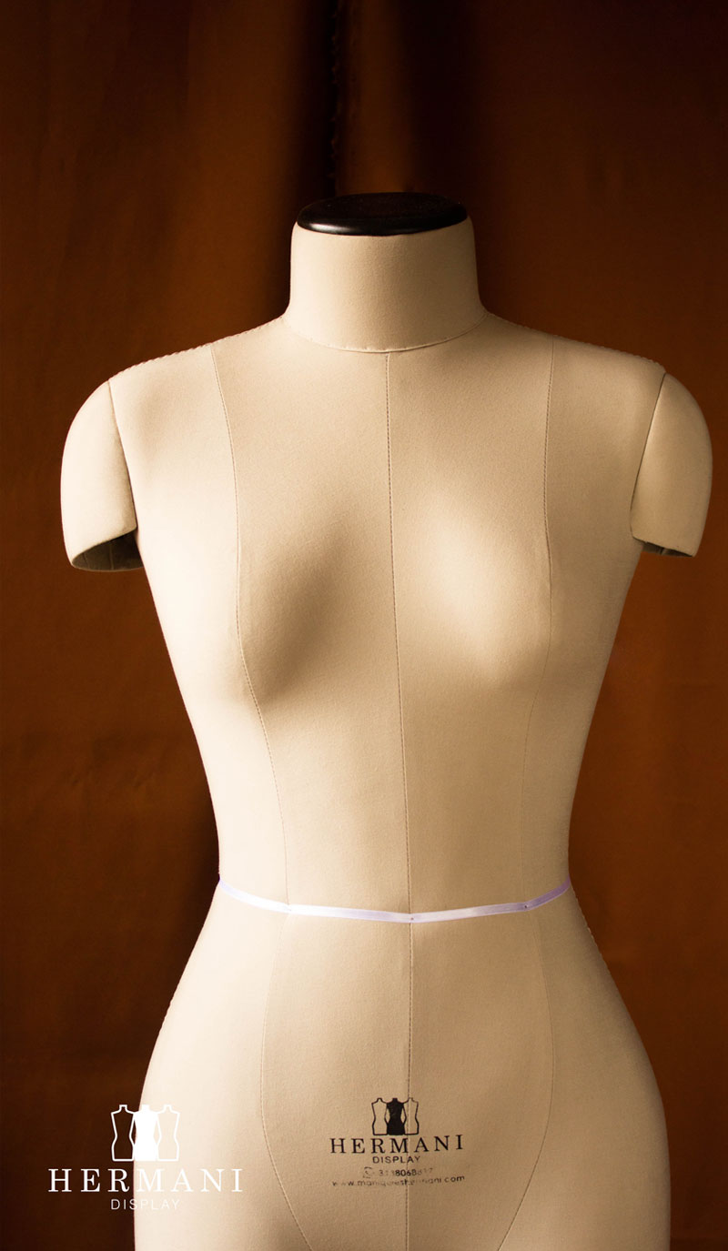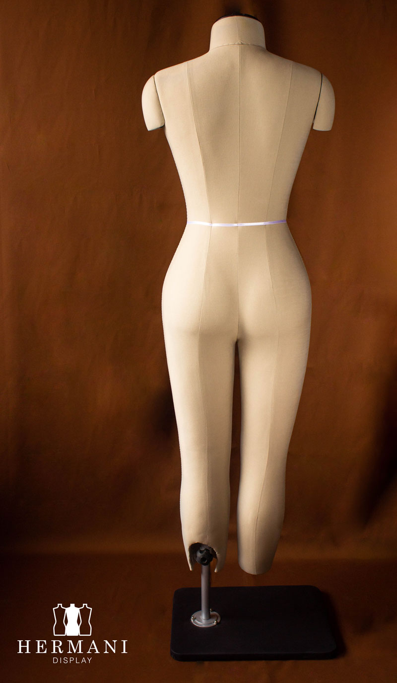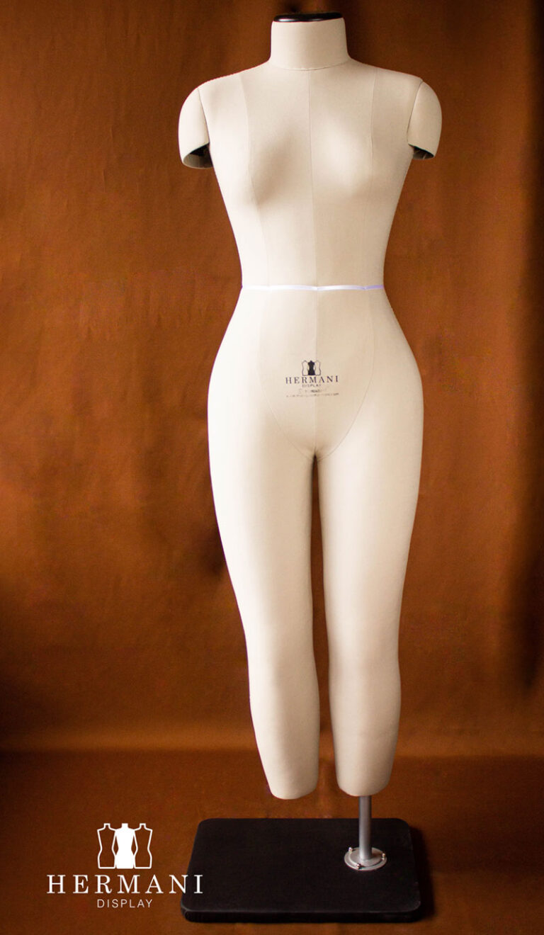 Maniquíes industriales con piernas largas y brazos: Tapizados en espuma y forrados en tela dril negro o beige, con o sin cintas de marcación, tapas decorativas en madera para hombros y cuello.
