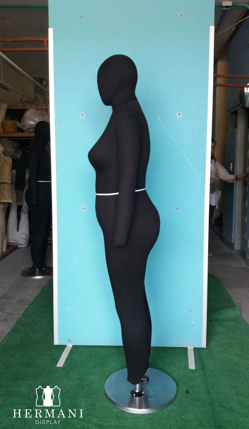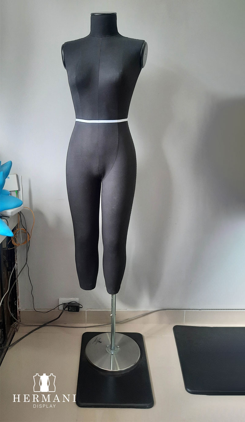 Maniquí industrial femenino para confección y drapeado, tapizado en espuma tela, dril negro o beige, que permite el uso de alfileres.