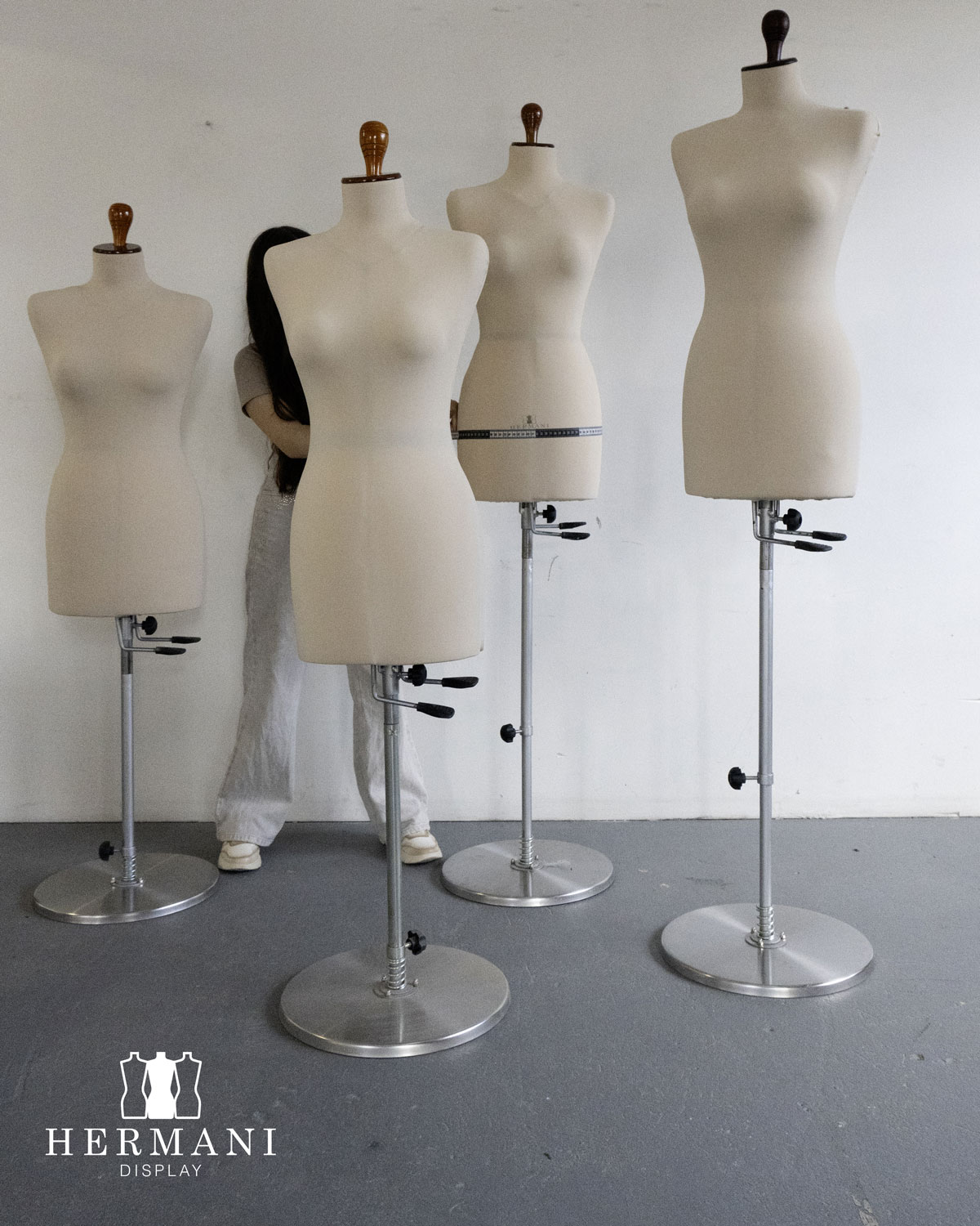 Maniquíes industriales femeninos para confección, ajustables y/o expansibles. Gradúa de la talla 8 a la 16, forrados en tela licra negra, beige y roja.